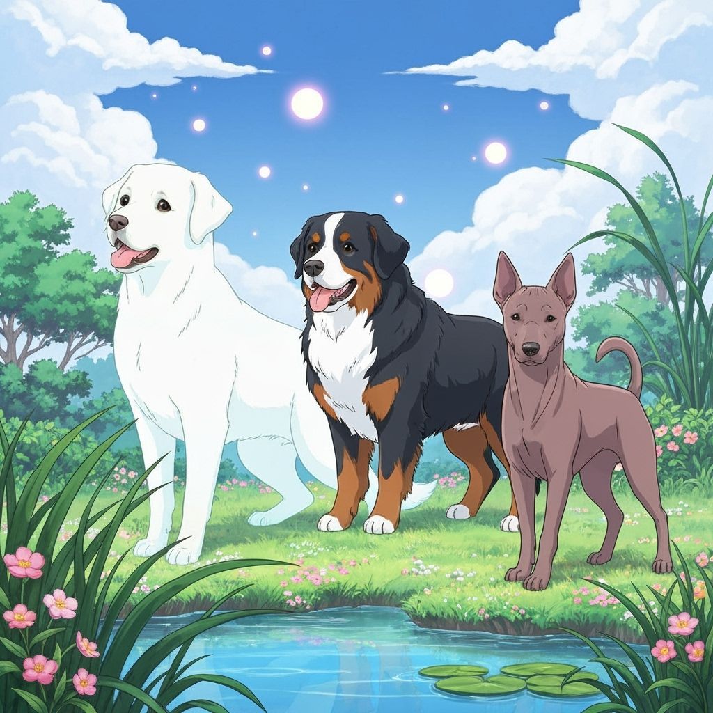 This image shows a dreamy anime-style paradise where the spirits of three dogs roam peacefully. The ethereal scene features vibrant flowers, lush vegetation, and translucent canines in a soft, glowing afterlife.