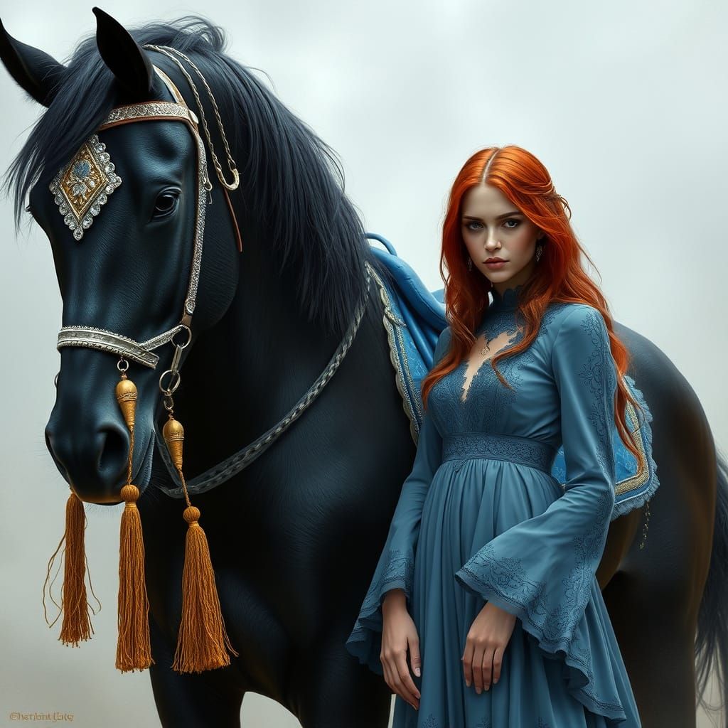 This image shows a striking scene of a majestic black horse adorned with sparkling silver accessories standing beside a woman with striking red and brown hair, set against a soft, misty background with a mix of photorealistic textures and subtle brushstrokes, evoking a sense of drama and emotion