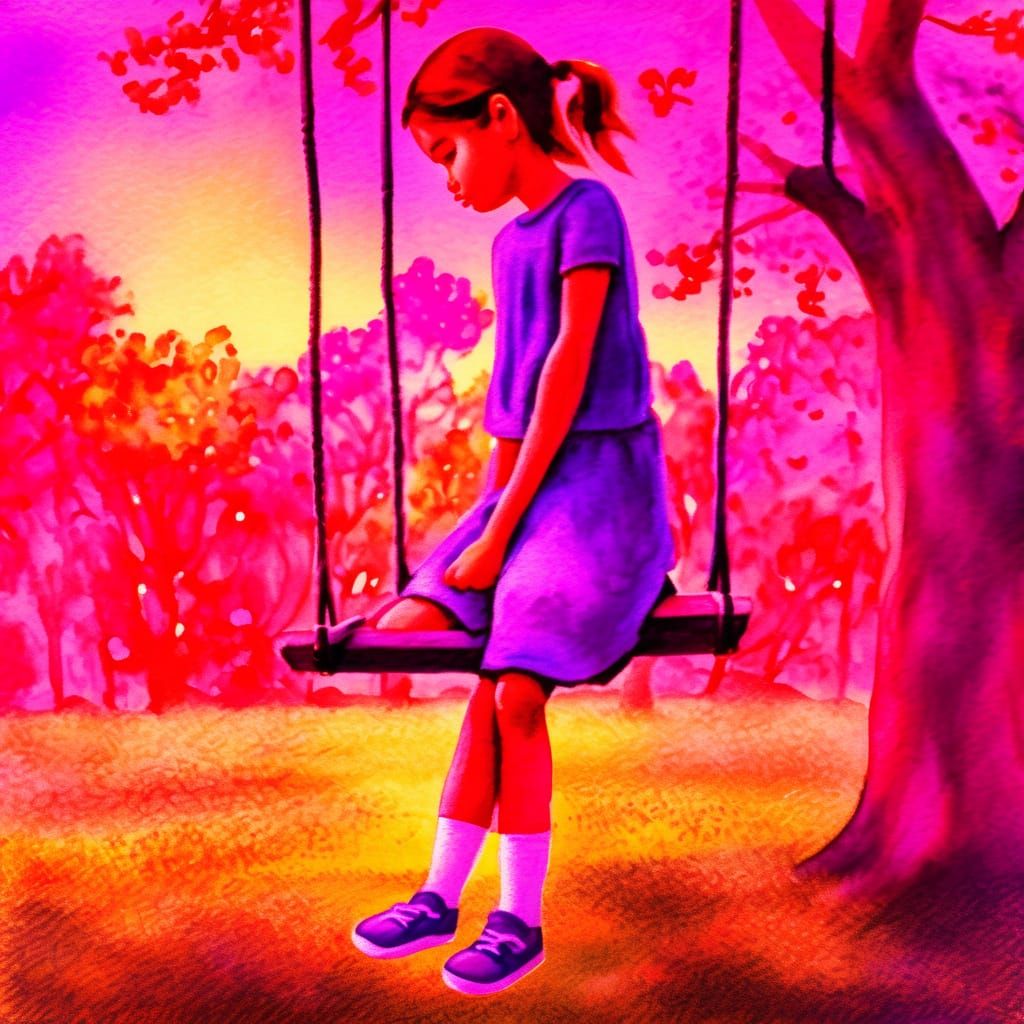 This serene watercolor painting captures a peaceful village park at sunset, with a little girl sitting on a swing, surrounded by softly blurred trees and a vibrant orange-purple sky, exuding a dreamy and idyllic atmosphere.