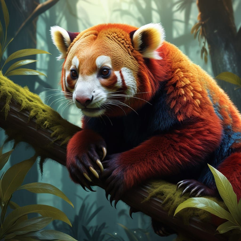 This hyperrealistic concept art showcases a stunning alien creature, blending characteristics of tigers, tree kangaroos, and kinkajous, set against a lush, vibrant background of foliage. The intricate details and luminous colors bring an otherworldly ecosystem to life.
