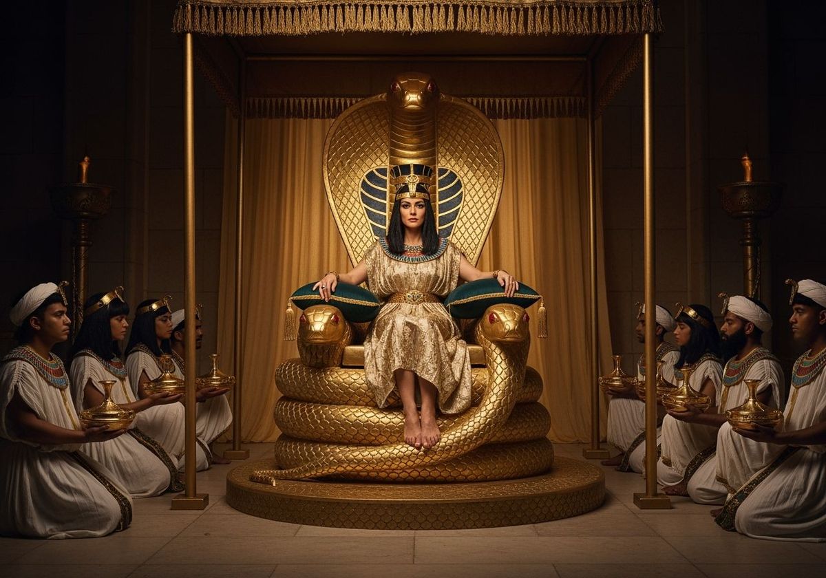 This image shows an Egyptian queen seated on a cobra throne within her palace, accepting tributes. The scene is depicted with a bokeh effect and natural lighting, reminiscent of professional photography.