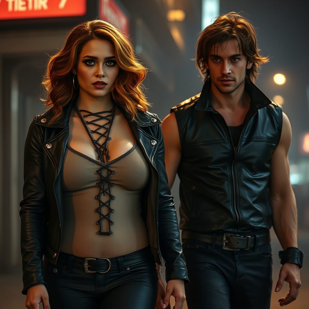 This image captures a curvy woman and a chiseled man in a dramatic, film noir-inspired pose, with intricate textures and smoky effects, evoking a cyberpunk aesthetic.
