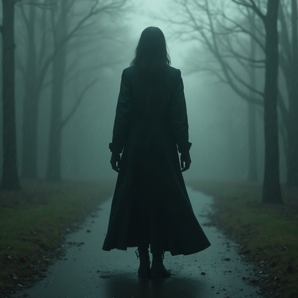 A mysterious woman in a long black coat stands alone in the rain, her ghostly face illuminated by surreal, eerie lighting in a dark, muted color palette, reminiscent of cyberpunk art.