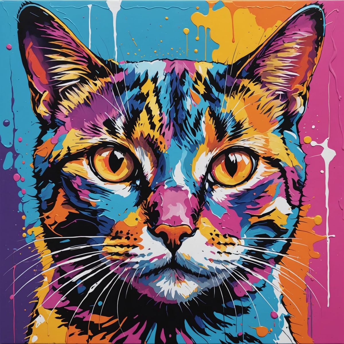 This image shows a cat's face in a vibrant pop art style, with bold, high-saturation colors and striking golden-yellow eyes. The background features energetic paint splashes, creating a modern, abstract feel.
