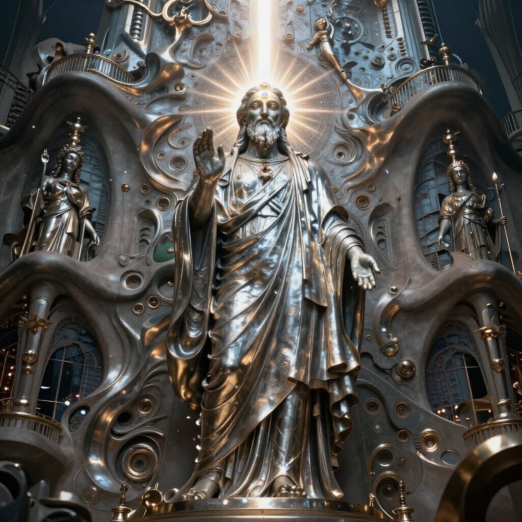 michelangelo painting style : Confucius ,very connected spiritual, gaudi in background, third eye chakra, ray of lights between characters, floating noise, ultra deep contrast, large scene composition, letters hologram : remember, bad argentic finish