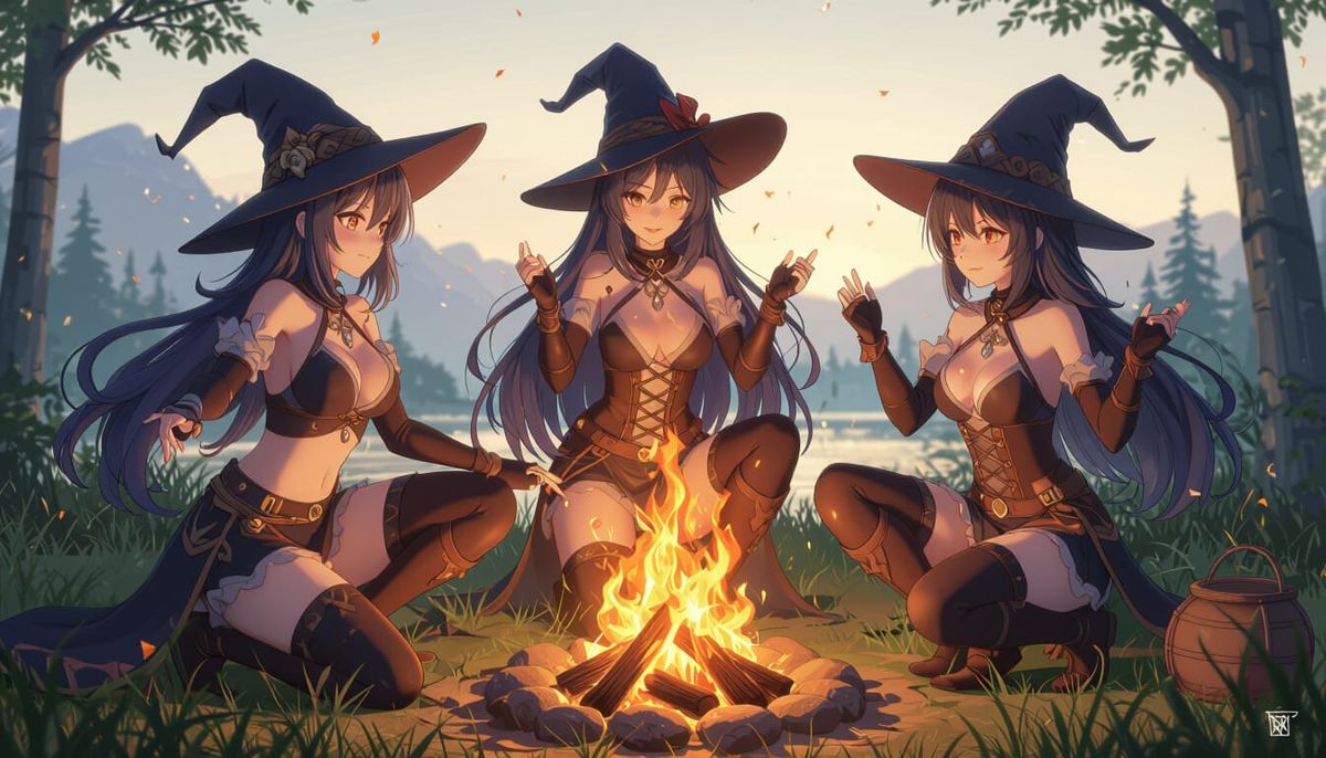 This image shows witches dancing energetically around a campfire with intense flames. The artwork features a highly detailed, breathtaking aesthetic inspired by 3D anime and concept art.