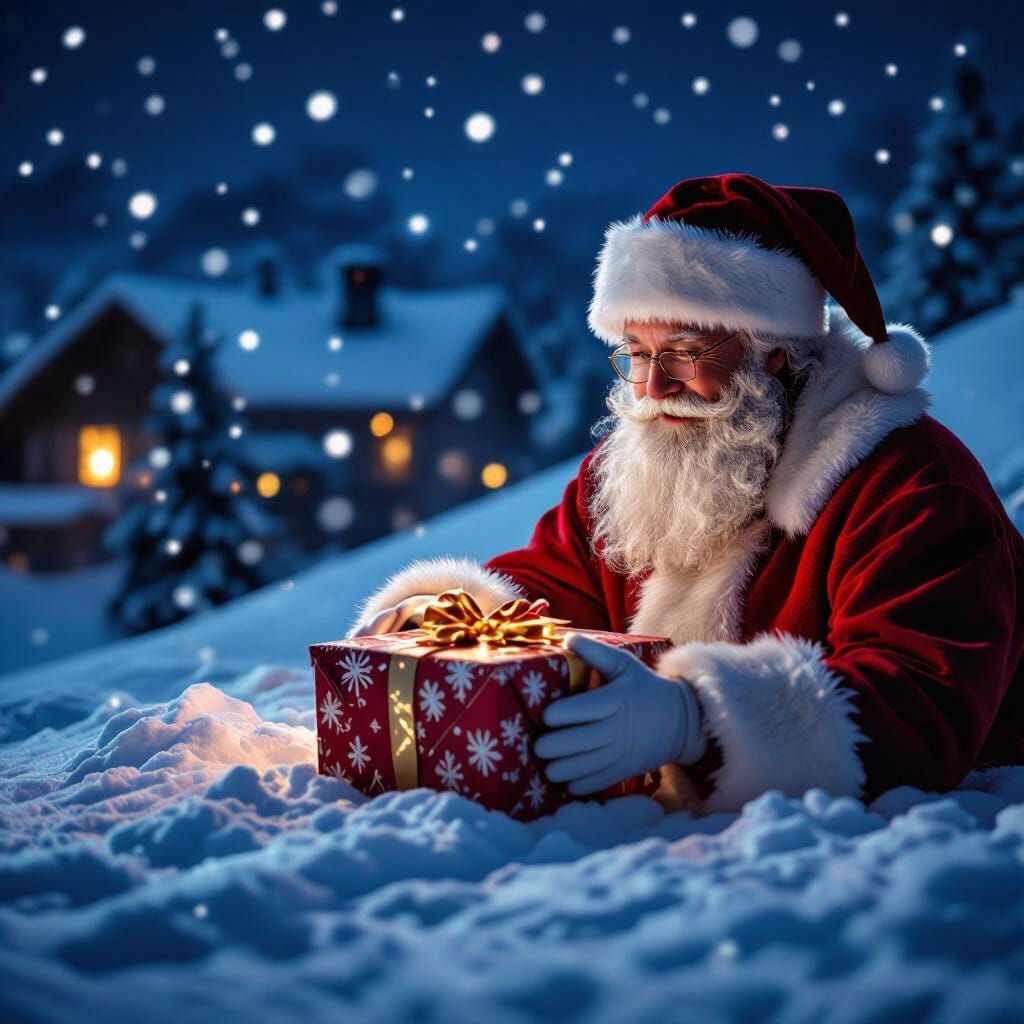 This image shows Santa Claus dropping off presents on a snow-covered roof. Cinematic lighting and a shallow depth of field create a dramatic, realistic scene.