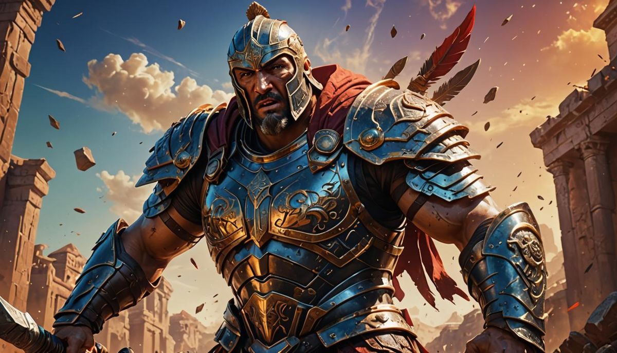 A striking picture of a muscular gladiator heroically holding planet Earth on his shoulders. The artwork features vibrant colors, dramatic lighting, and intricate details in a splash art style.