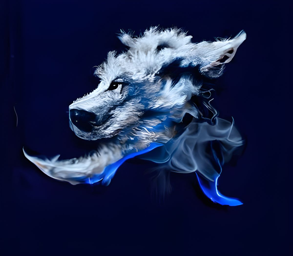 This image shows a wolf engulfed in blue flames. The digital artwork depicts a dramatic scene with vibrant colors and intense energy.