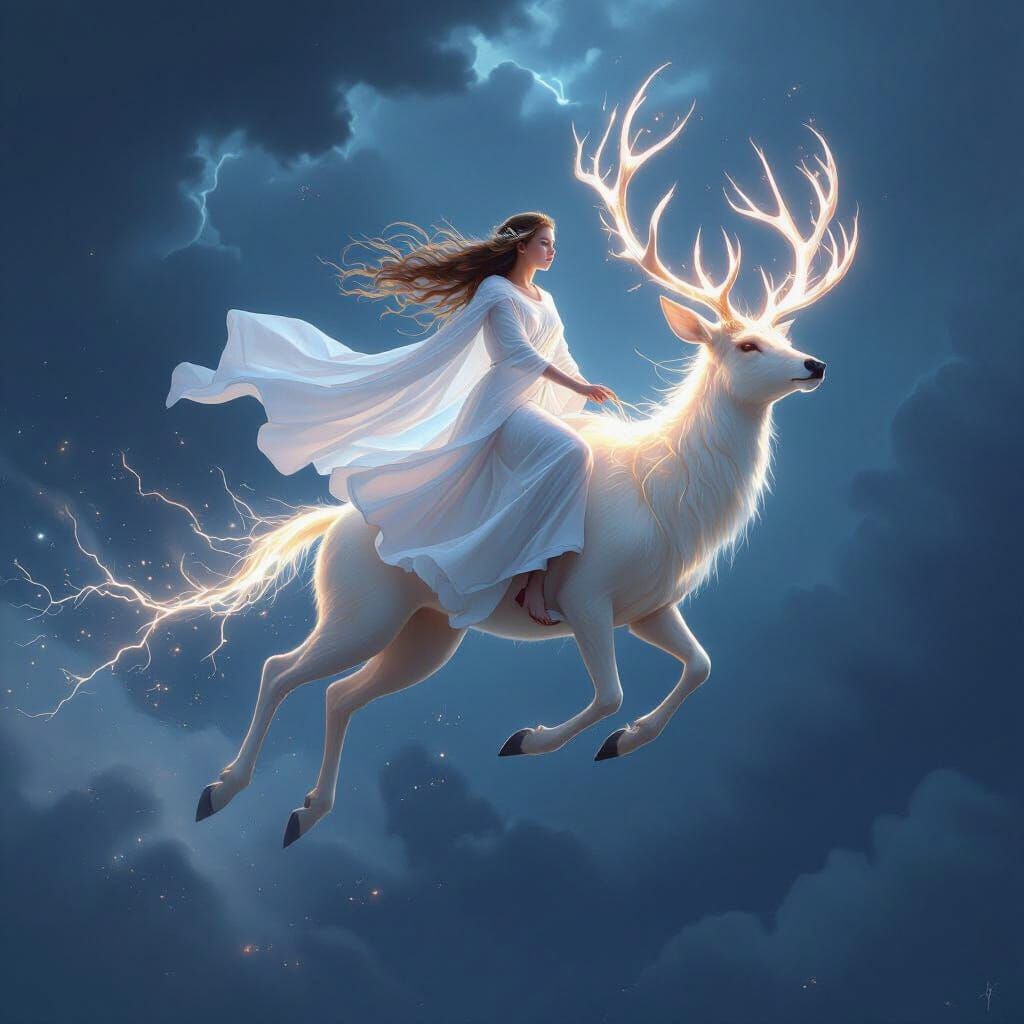 This image shows a goddess in white robes flying through a stormy night sky on a majestic lightning deer. The vibrant, dreamy art style features ethereal glows and an atmospheric aesthetic.