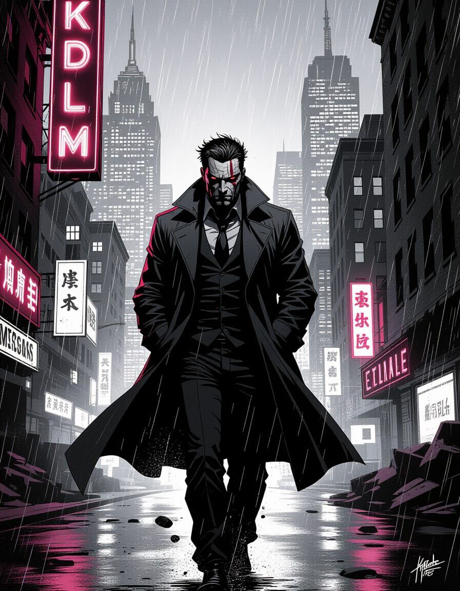 This image shows a detective in a dramatic, windswept coat silhouetted against neon lights. Dynamic lighting and stark contrasts create a tense, cinematic atmosphere, reminiscent of classic comic book art.