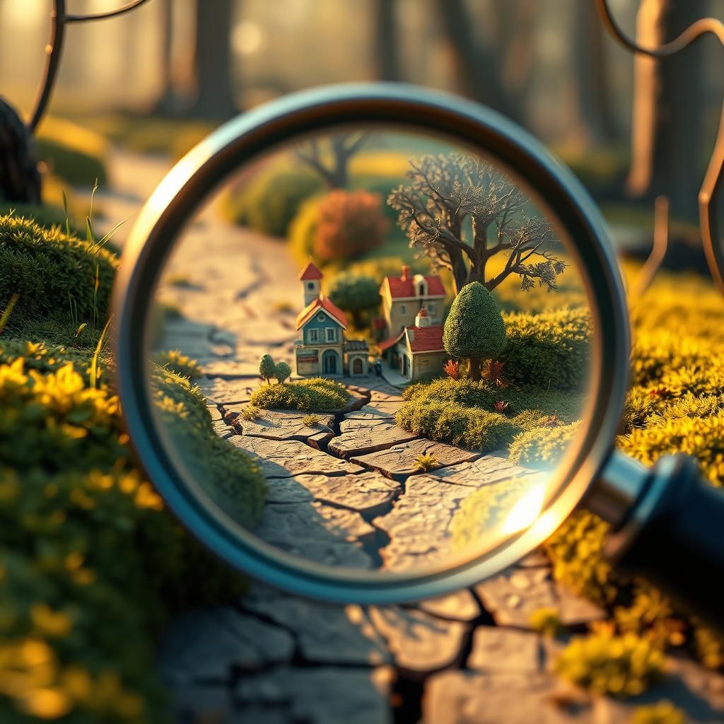 This image shows a magnifying glass over a footpath, revealing a miniature civilization within its lens. The scene is rendered in stylized 3D with warm lighting, blending realistic textures with whimsical elements.