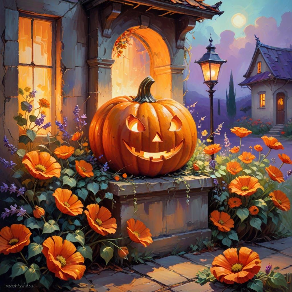 This oil painting showcases a smiling pumpkin surrounded by poppies, ivy, and lavender. Featuring thick, textured brushstrokes and vivid, warm autumnal colors, it has an ethereal glow from a nearby lantern.
