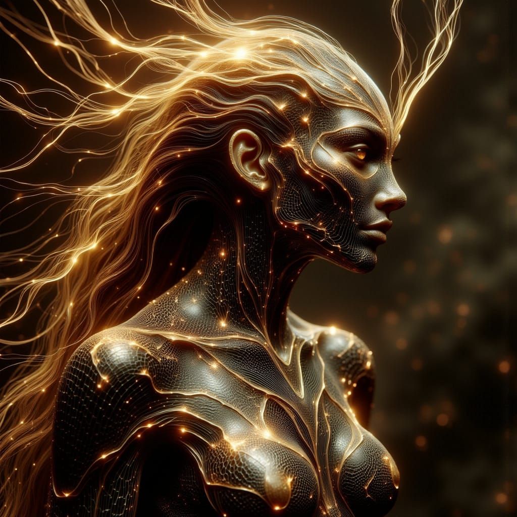 A Portrait <lora:-Spectral Echo-:1.0> Pharaoh ant with liquid shadow contours and radiating filaments in golden colors. The background is golden and black meshed with the Pharoah Ant and background. Inspired by @Darken Lora. A mistake but i think it is beautiful