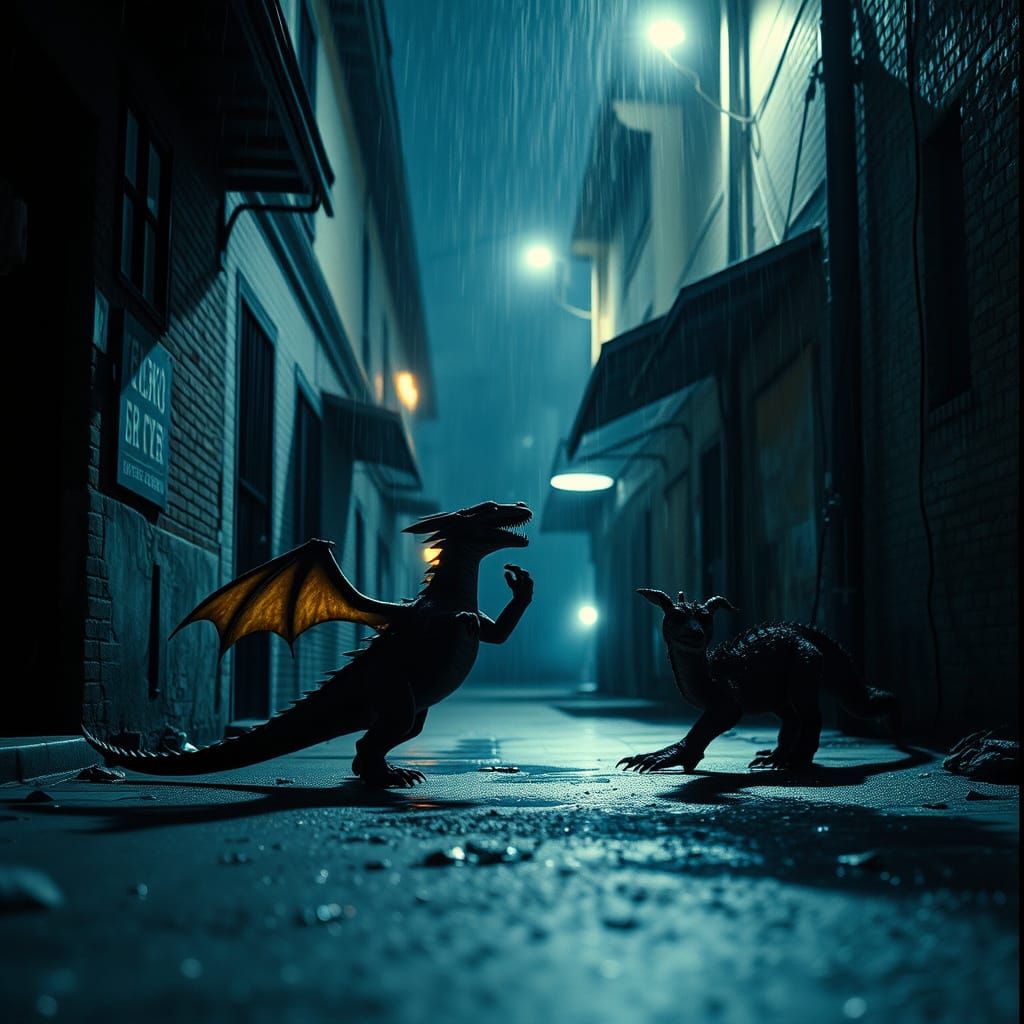 This image shows a cinematic scene of a baby dragon battling a baby chupacabra in a dark, rain-soaked alley of Neo-Tokyo. The image has a film grain effect and dramatic, atmospheric lighting.