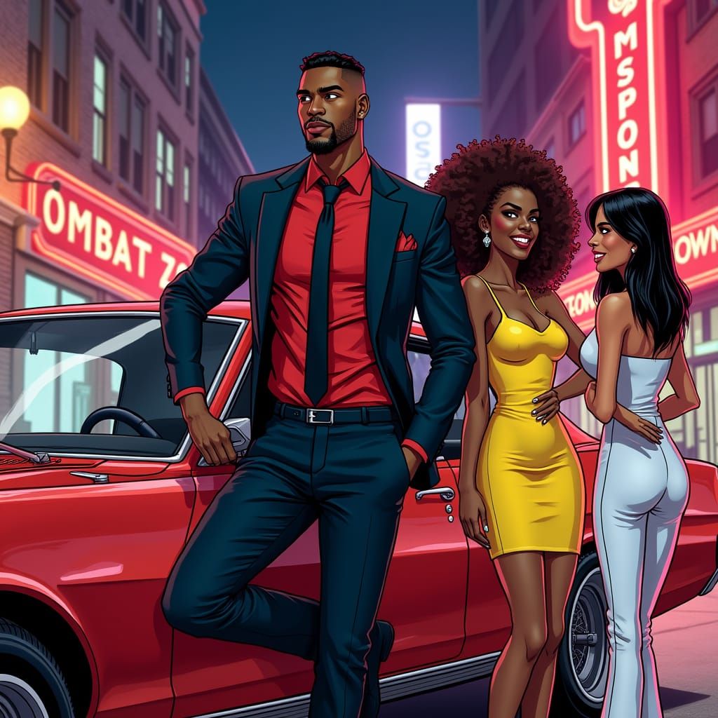 This image shows a stylish African American man leaning on a red sports car in Boston. Two women are beside him, rendered in a graphic novel style with bold lines and vivid colors.