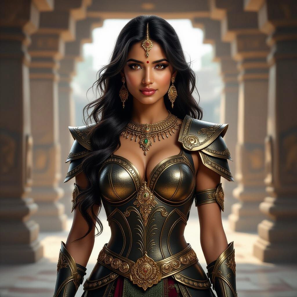 This image shows a beautiful Indian woman with dark hair and a gold bindi, confidently standing in an ancient temple. She is adorned in intricate dark metal and gold armor, rendered in high detail.