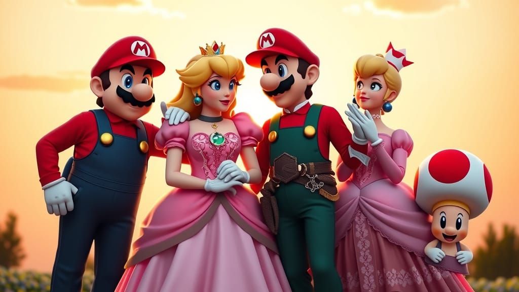 A tender image of Mario, Luigi, Princess Peach, and Toad sharing a moment of camaraderie against a warm sunset backdrop, their faces etched with relief and gratitude, in a style reminiscent of Waterhouse's sentimental realism.