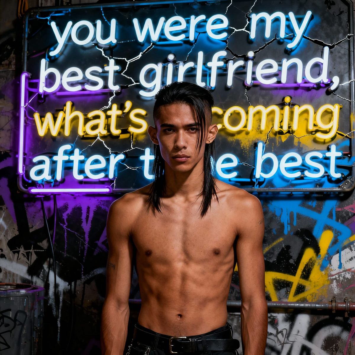 This high-definition image captures a Eurasian man with a thin, asymmetric haircut in a dystopian setting. The artwork features bright, contrasted colors and detailed textures, creating a dramatic, cinematic effect.