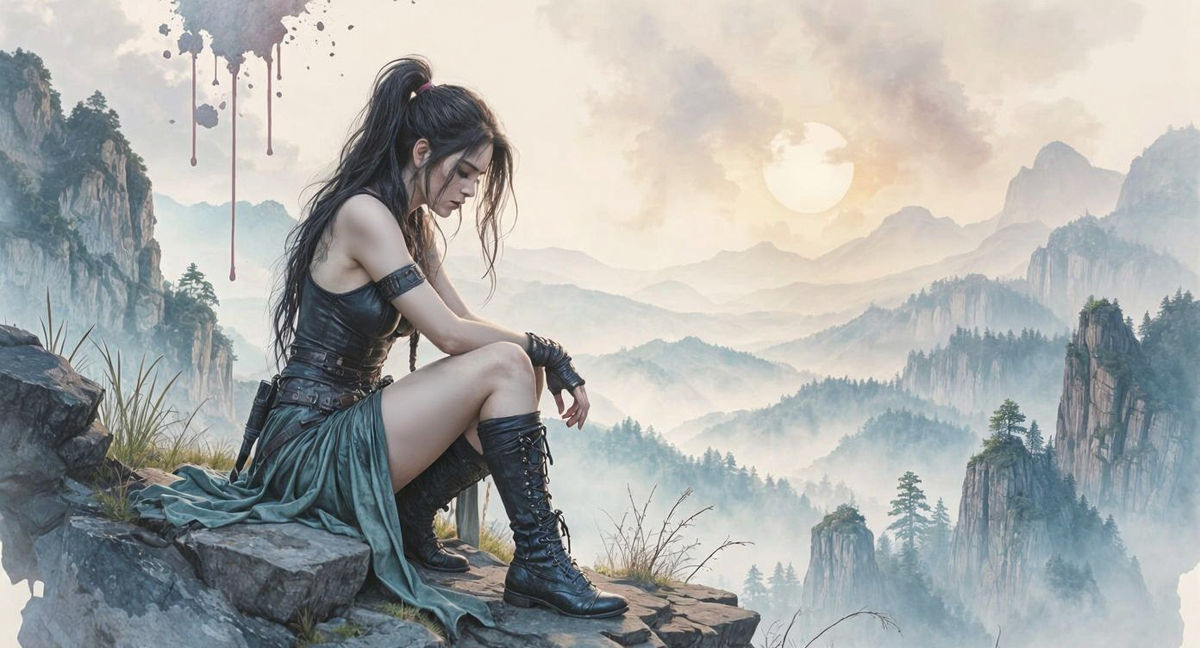 A beautiful female warrior, , sits on a rocky outcrop ....