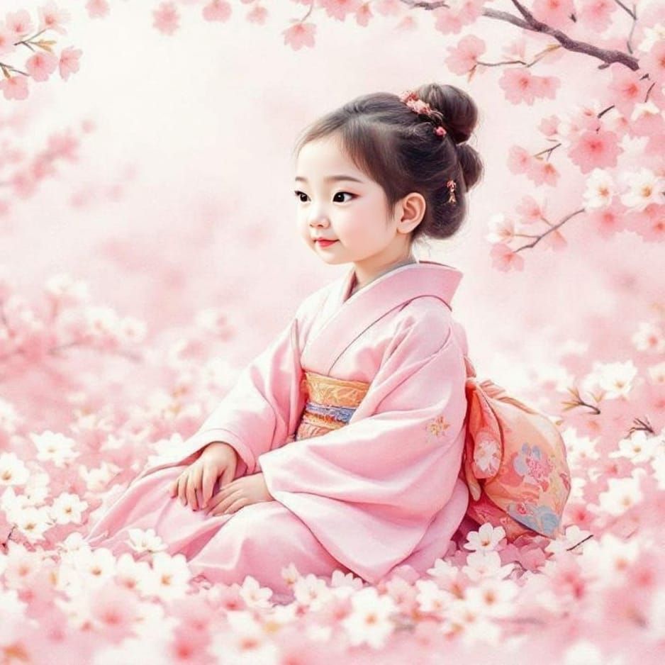This image shows a shy two-year-old Japanese girl in traditional geisha attire, sitting among pink cherry blossoms. Rendered in Japanese watercolor style, the artwork features soft pink hues and delicate brushstrokes.