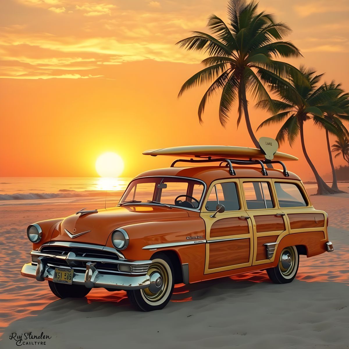 A vintage-style surf poster of a woody station wagon on a beach at sunset. Palm trees sway in the breeze, capturing the essence of classic surf art with warm, inviting colors.