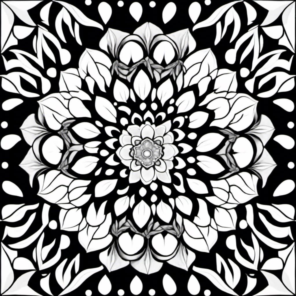 This image shows a black and white mandala flower illustration designed as a coloring book page. The simple yet intricate design stands out against a stark white background.