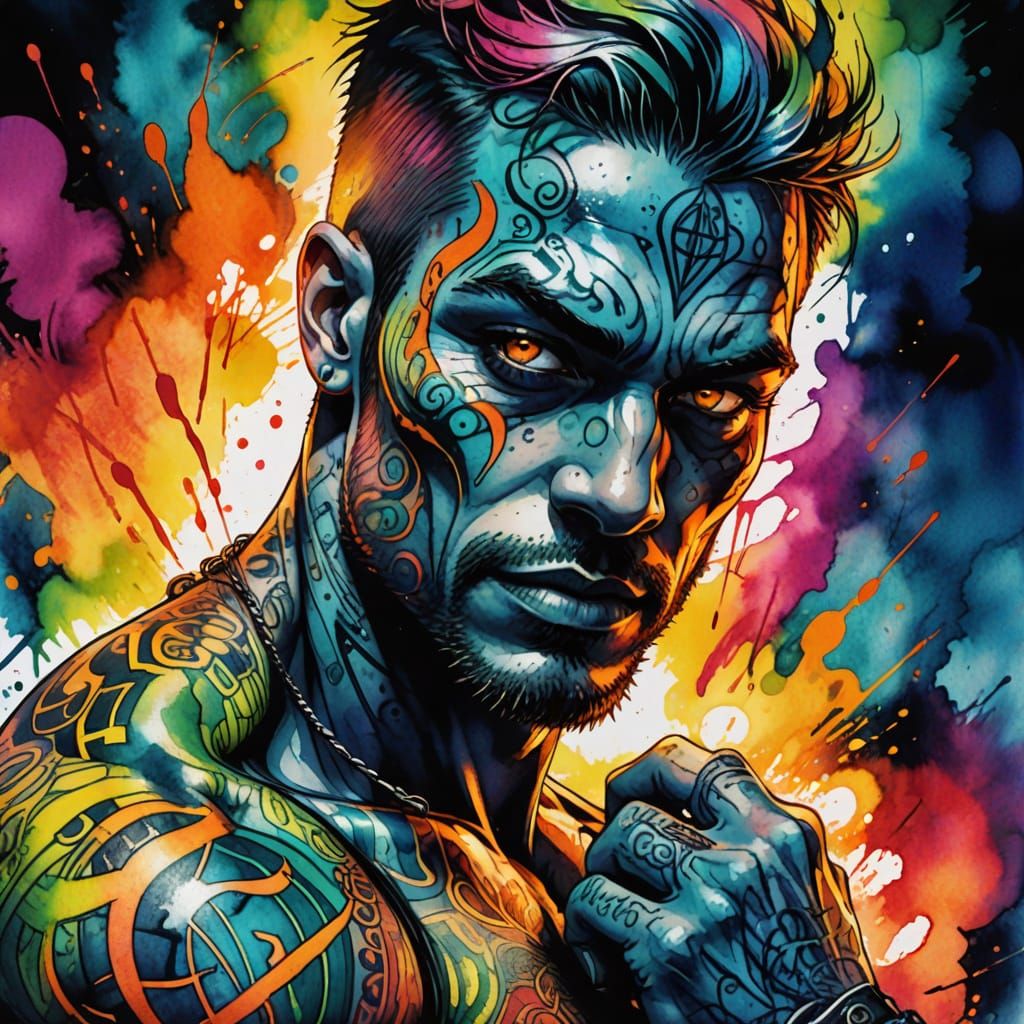 This image shows Ink, a character with glowing tattoos across his arms and face. The tattoos pulse with colorful pigment, manifesting as raw force in a vibrant watercolor style.