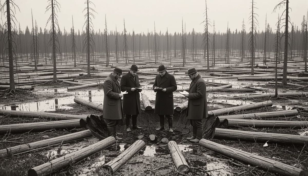 A realistic scene of a 1920s scientific expedition in Siberia examining the Tunguska event site. Rendered as an archival black-and-white photograph, highlighting mystery and desolation.