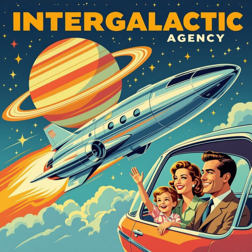 A vibrant 1960s-style advertisement illustration for a fictional intergalactic travel agency. A sleek, chrome spaceship is depicted soaring past a stylized, ringed planet, with a smiling, retro-futuristic family waving from a viewing window. The color palette is bold and saturated, featuring primary ...