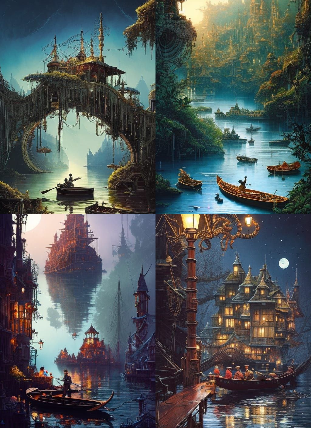 This image shows a boat gently gliding down a stream. A watercolor splash art style with dark and gritty tones evokes a dreamlike, hyper-detailed, and fantastical aesthetic.