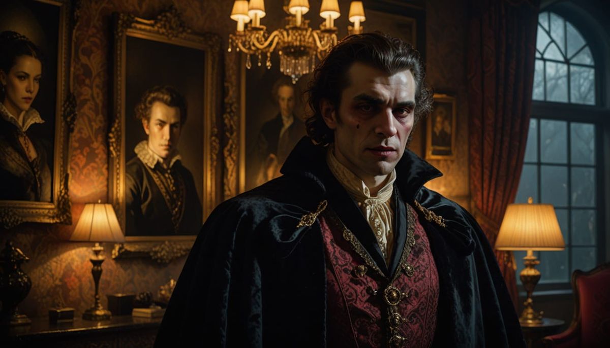 This image is a lavish depiction of a vampire in a luxurious modern hotel room, surrounded by opulent fabrics and lavish furnishings, with dramatic lighting and rich colors, reminiscent of an old master style painting.