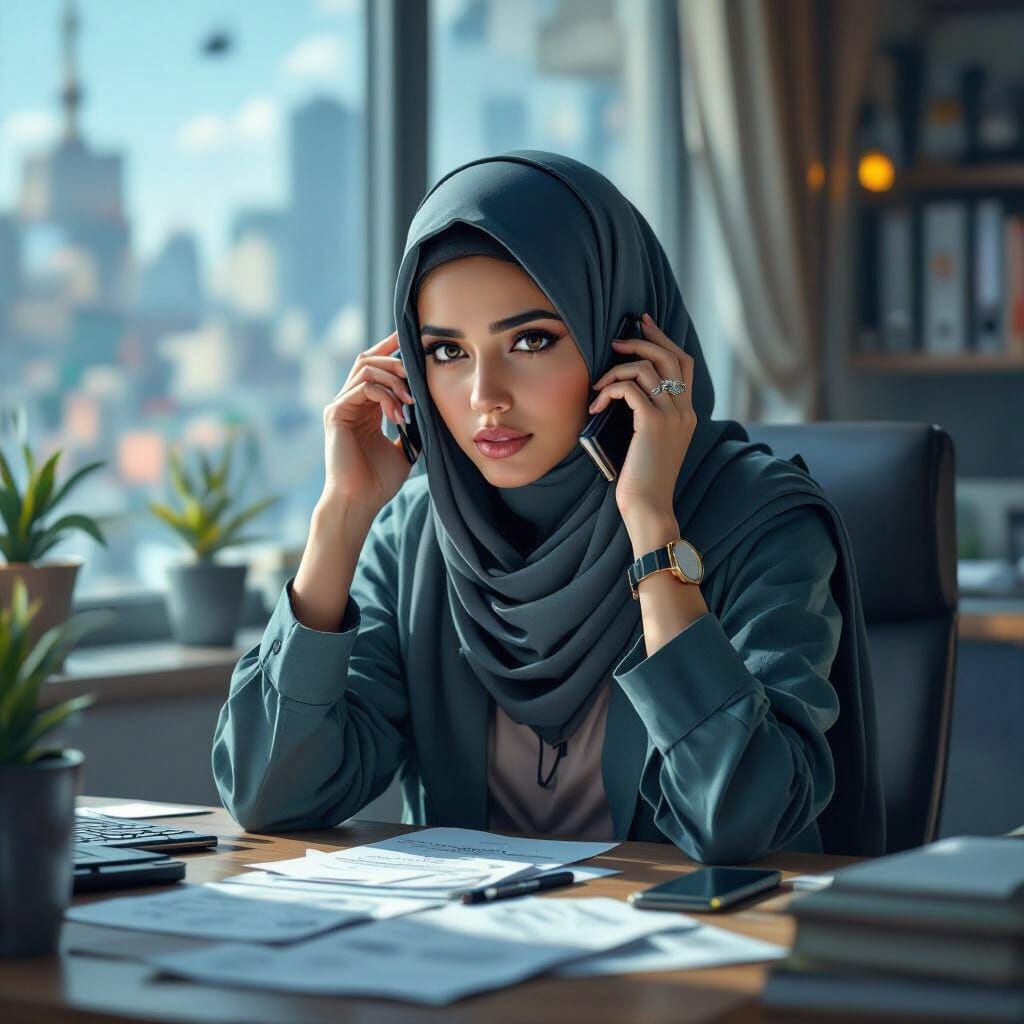 This image shows a young Egyptian hijabi woman appearing stressed while working at a desk. The artwork features deep colors and intricate details in a matte painting style.