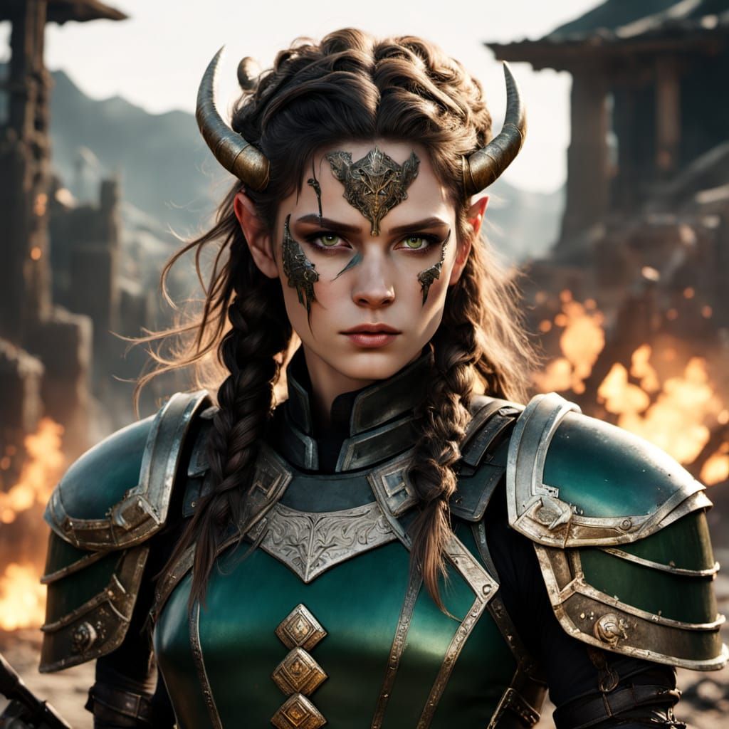 This image shows a female Tiefling paladin in black armor holding a war hammer. She has emerald green eyes, dark brown horns, and ivory skin. The scene is set in a ruined wasteland with golden hour lighting, rendered in a dark fantasy style.