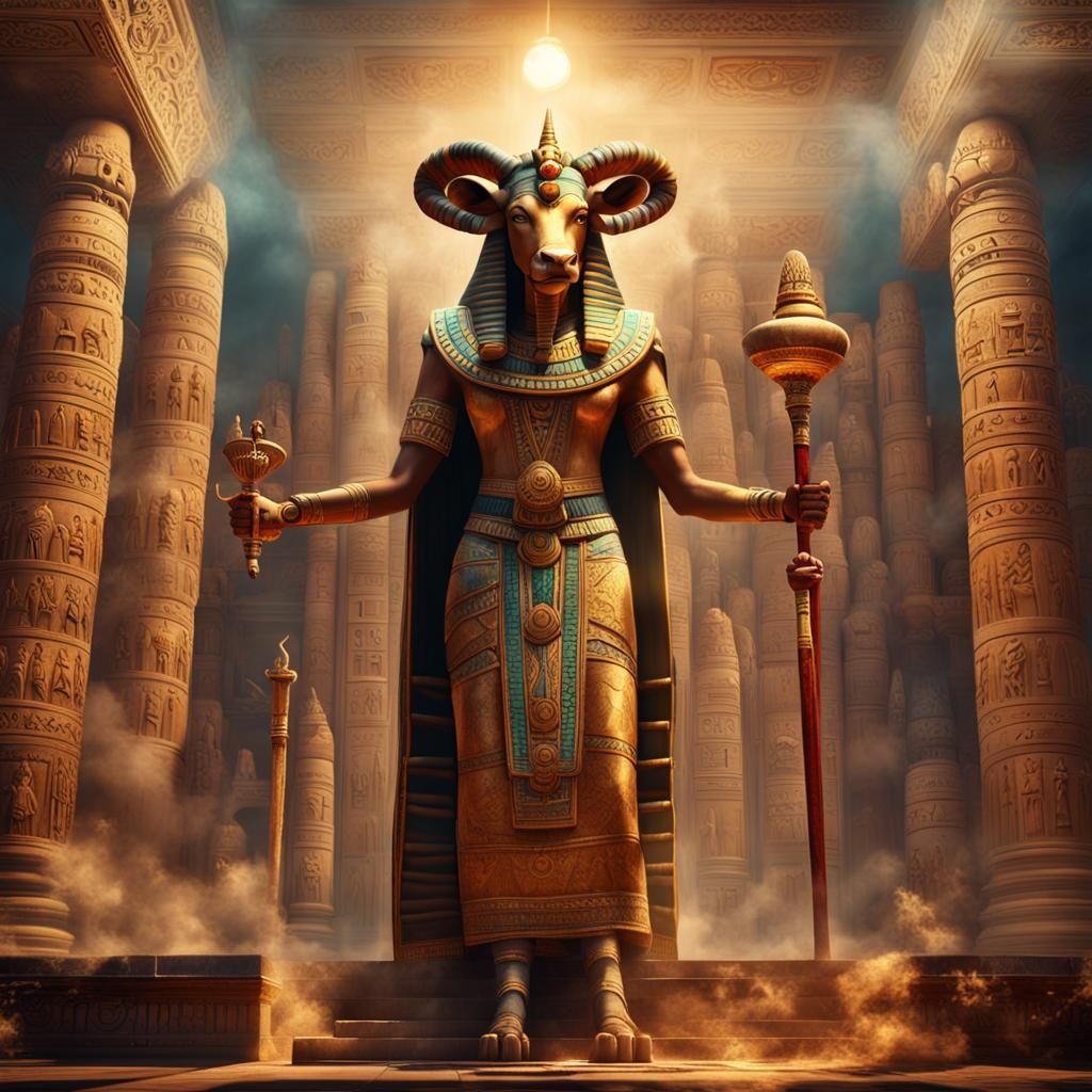 This image shows Hathor, the cow-headed goddess, dancing amidst incense in an ancient Egyptian temple. Rendered in a dramatic, maximalist digital matte painting style.
