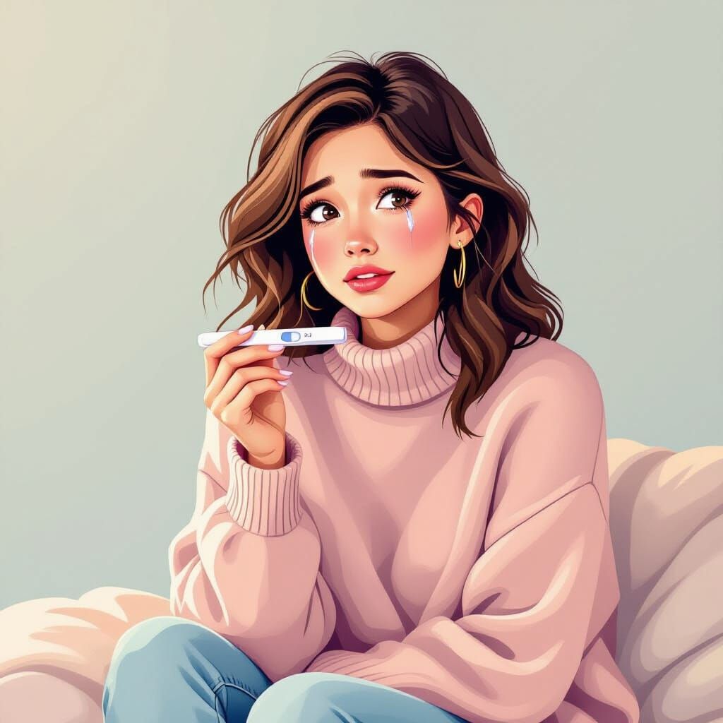 This image shows a young woman, with tears on her face, hopefully looking at a pregnancy test. The scene is softly lit with bright pastel colors, in a Kawaii art style.