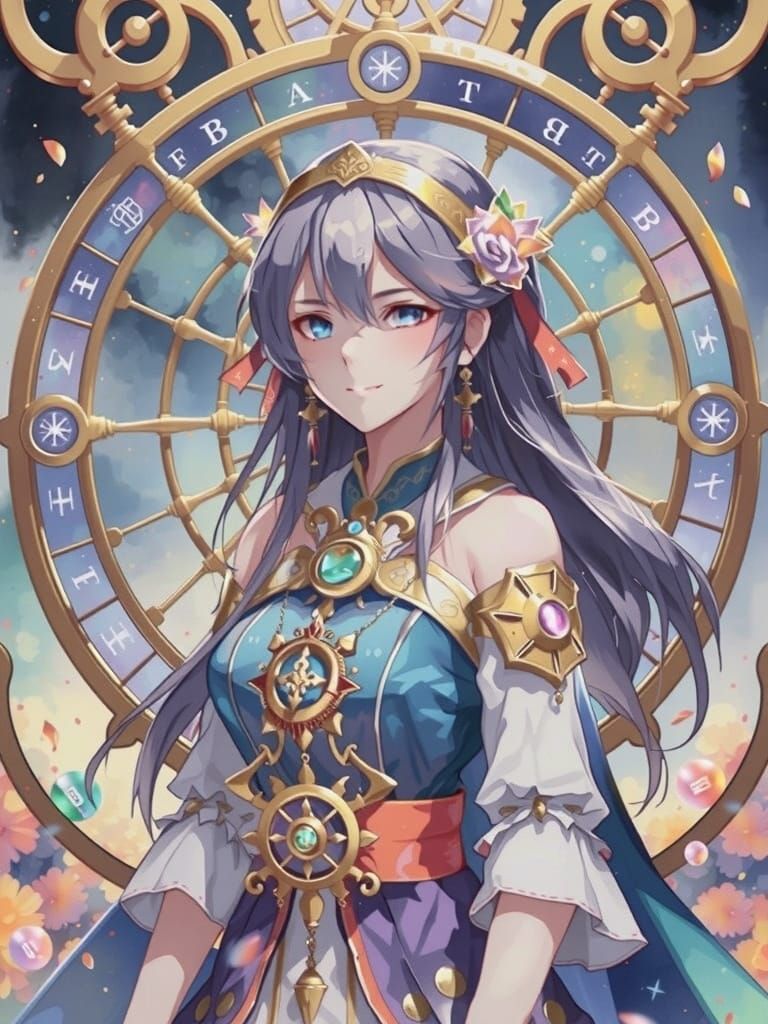This image shows a central figure in anime-style watercolor art, surrounded by mystical symbols as the Wheel of Fortune turns. The artwork features soft, blended brushstrokes and pastel colors.
