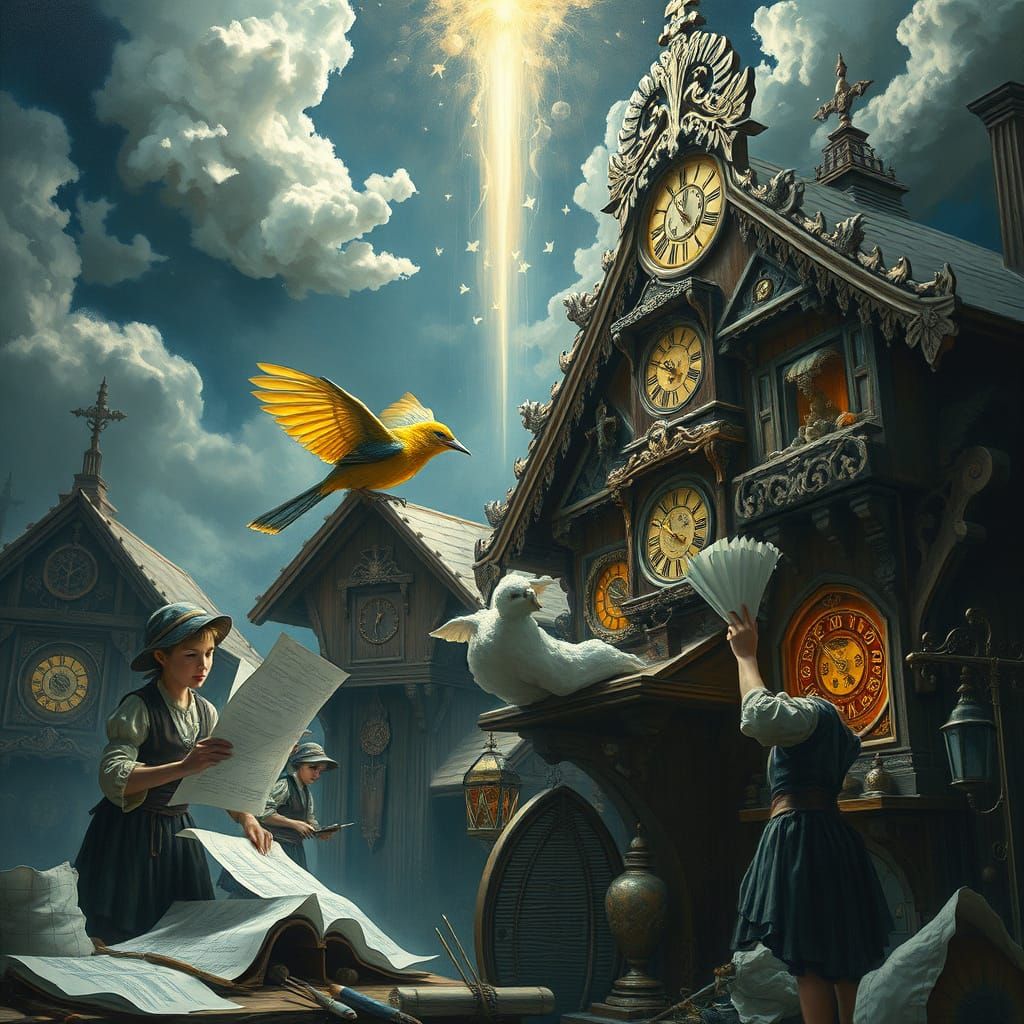 surreal mter painting with oil and matte details and pencil sketching of half painted elves building dynamic coocoo clocks with coocoo bir.