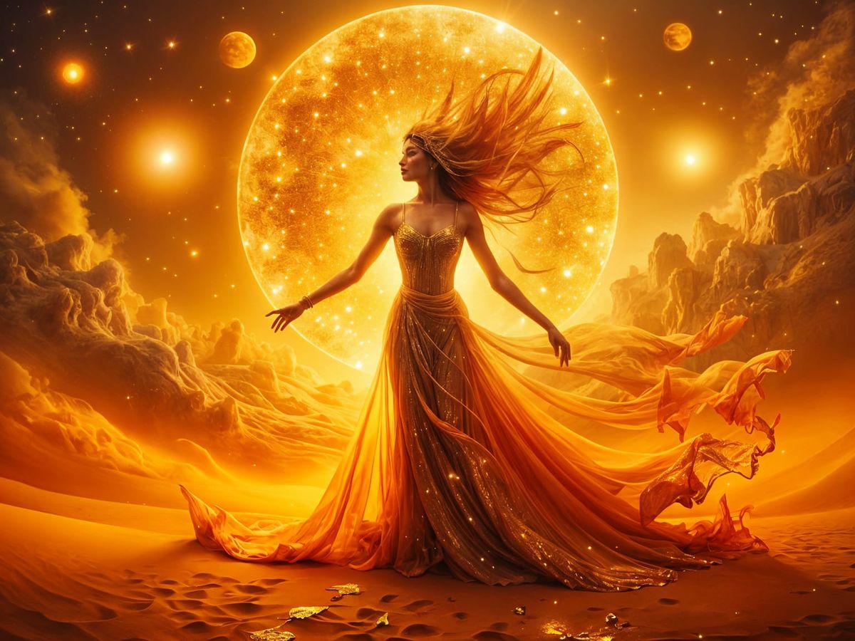 This image shows a fantasy cabaret in a golden desert. Dancers emerge from dunes like visions, with flowing veils of sequins and feathers, lit by sun-shaped spotlights. A blazing sunset completes the dreamy scene.