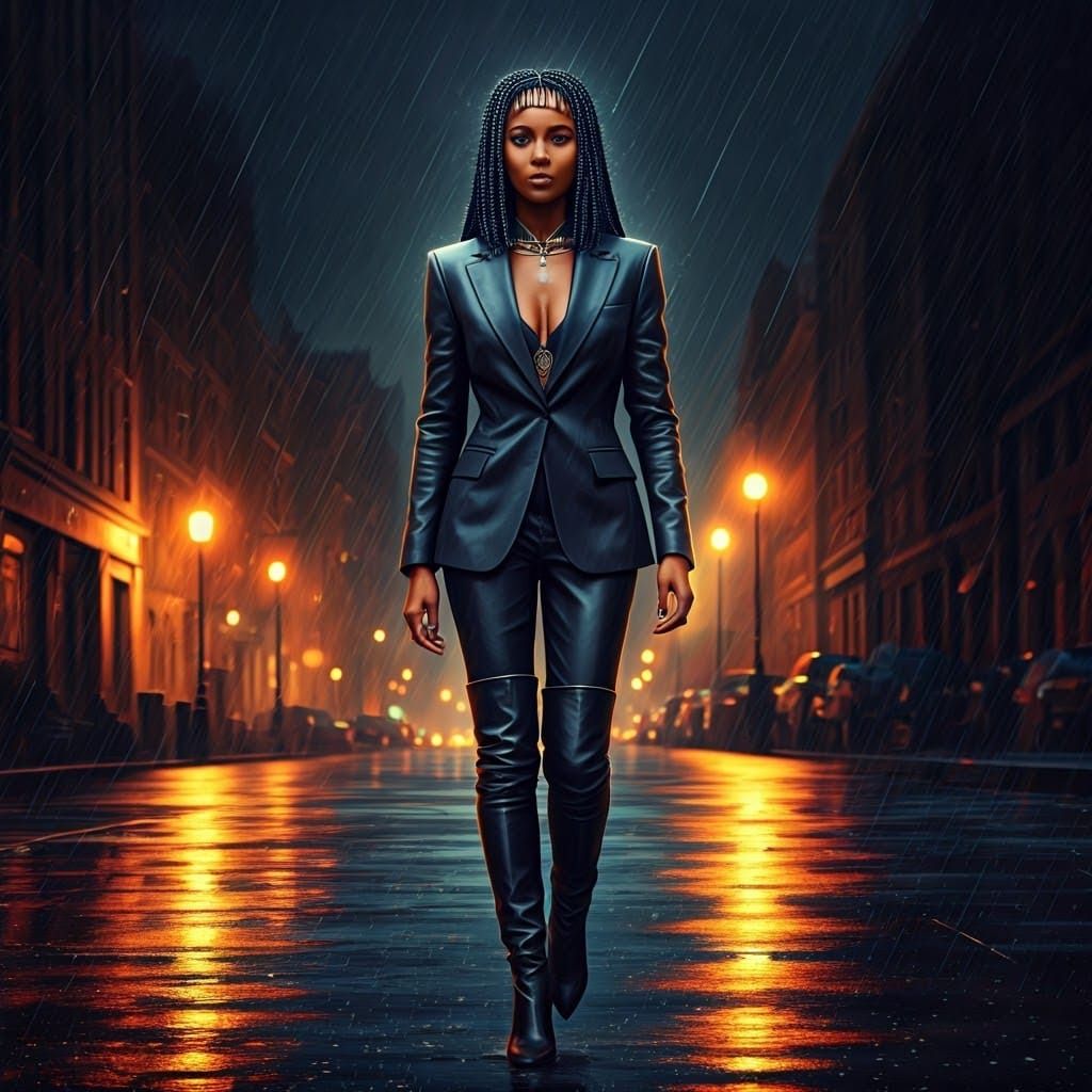 BLACK QUEEN CLEOPATRA WITH BRAIDED HAIR DRESSED IN AN ALL-BLACK, BLACK LEATHER BUSINESS SUIT WITH BLACK LEATHER THIGH BOOTS WALKING IN THE STREETS ON A RAINY DAY.
