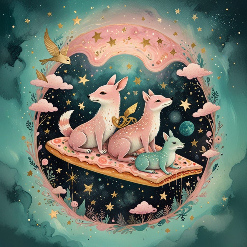 A whimsical illustration featuring anthropomorphic animals riding flying pizzas beneath a starry sky. The artwork evokes gentle alcohol ink textures, soft pastel colors, and golden accents.
