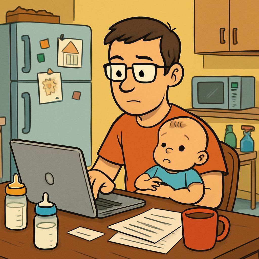 This image shows a man with short brown hair and glasses sitting at a kitchen table holding a baby while using a laptop. It's a cartoon illustration of family life.