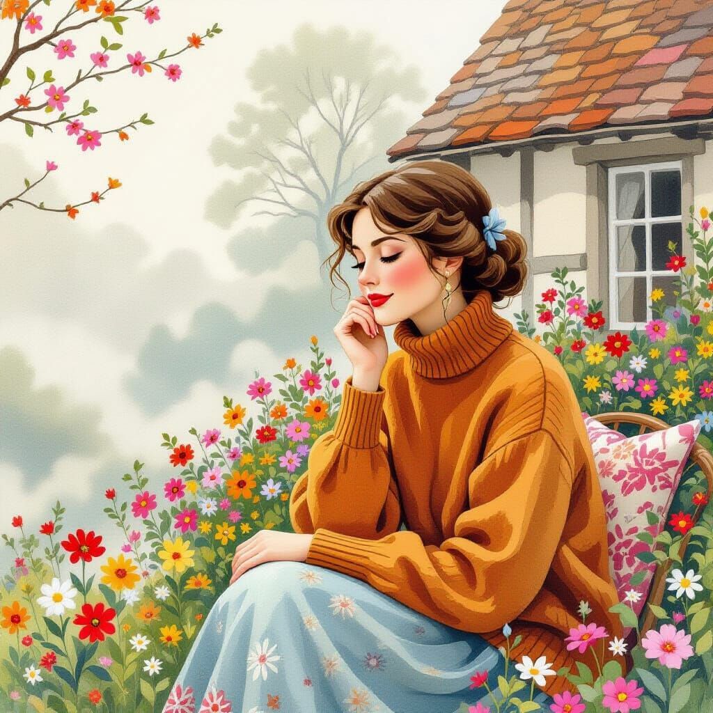 A serene woman in a sweater sits by a cozy cottage amidst mist and blossoms. Evokes a charming vintage painting aesthetic with intricate details and whimsy, in the style of classic children's book illustration.