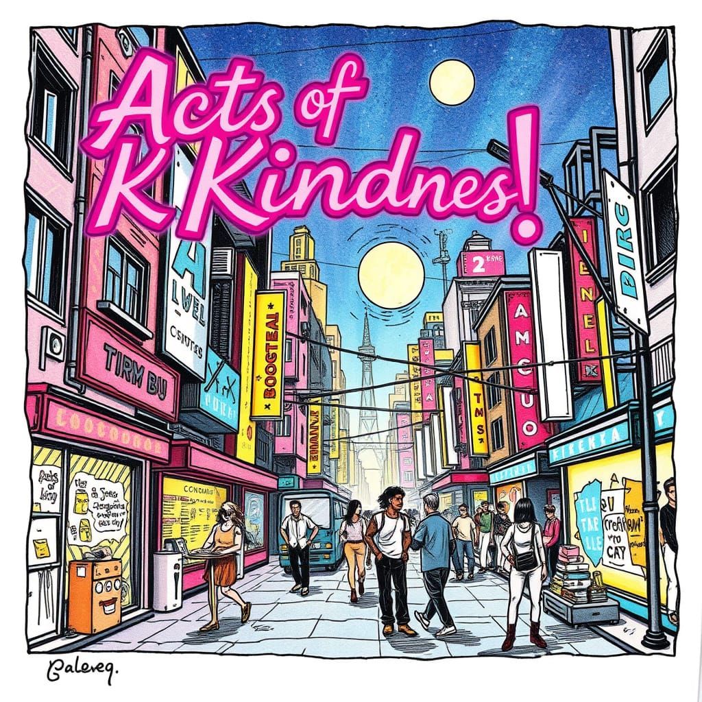 This image depicts a vibrant, happy future city bathed in bright, metallic light, evoking a sense of utopia and joy through a detailed ink drawing style.
