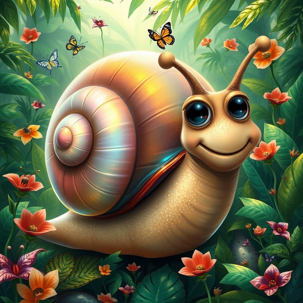A vibrant jungle scene featuring a large, gleaming snail with smiling eyes and a rainbow shell. The snail is surrounded by tropical foliage and magical creatures, rendered with intricate detail and soft, ethereal light.