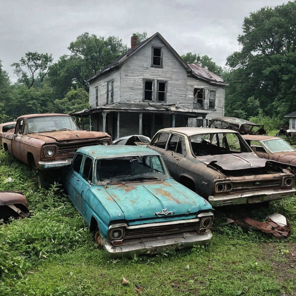 This image depicts a desolate West Virginia valley scene. Dilapidated houses and junk cars litter the yards on a dark, rainy afternoon, creating a somber and haunting atmosphere.