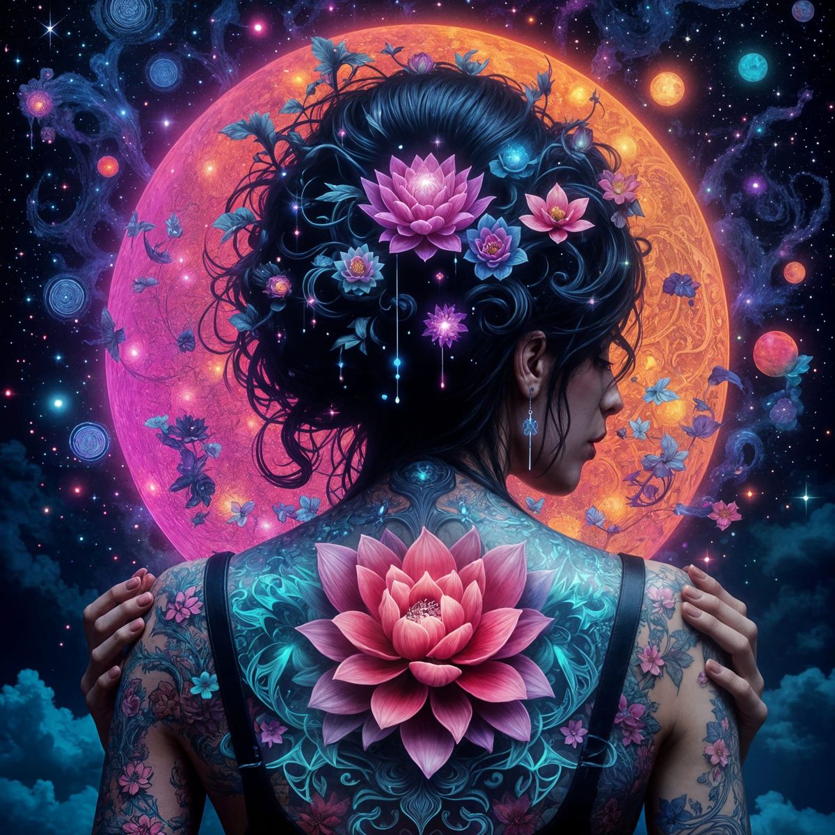 This image shows a woman with a vibrant lotus tattoo on her back. The artwork has a holographic, cosmic aesthetic, reminiscent of mixed media illustrations.