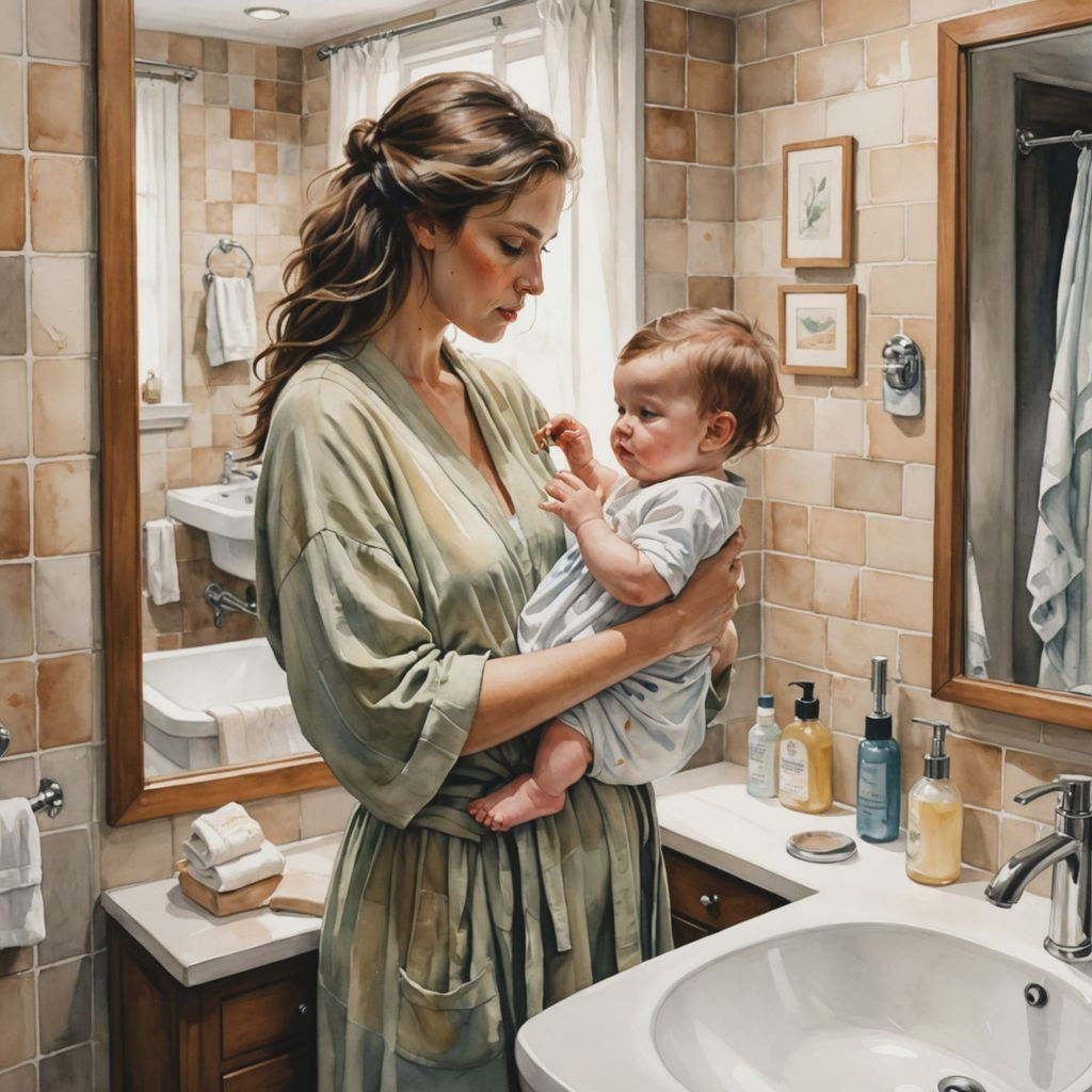 This image shows a serene watercolor painting of a young mother in a modern bathroom, gently applying makeup while breastfeeding her baby. The artwork uses muted earthy tones and soft lighting to capture a moment of warmth and tenderness.