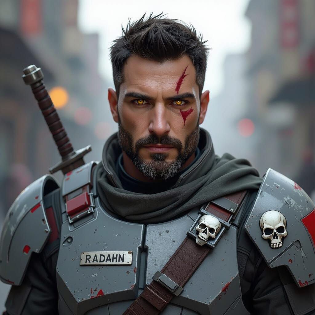 This photorealistic image shows a stocky human soldier in detailed grey armor with red accents. His pauldron displays a skull emblem, and he has distinctive hazel eyes and facial hair.