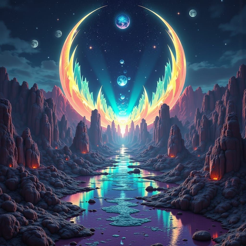This image features a giant, abstract geometric structure floating near a crescent moon, with crystal diamond reflections and refractions.